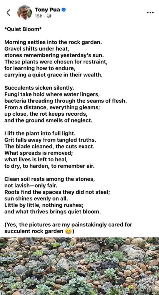 潘俭伟昨日在面子书分享自己栽种的多肉植物照片,并配上一段自创诗文,形容植物的病变往往在无声中发生,真菌与细菌在不易察觉的情况下滋生蔓延。他以“将植物置于光下”为意象,暗示当光线照亮,一切纠缠与隐藏的真相终将显现。