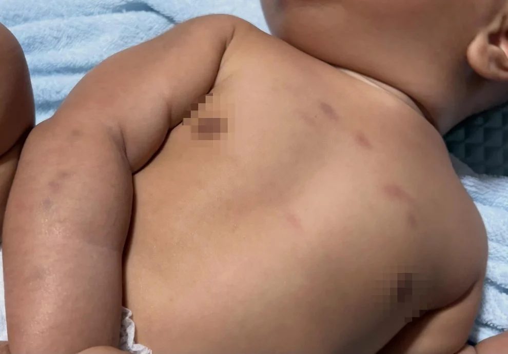 她说,约两周前,丈夫在替孩子洗澡时,发现其身上出现多处大小不一的瘀痕,两人立即带孩子前往医院检查。医生初步判断,瘀痕疑似因遭人捏伤或被过度用力抓抱所致。