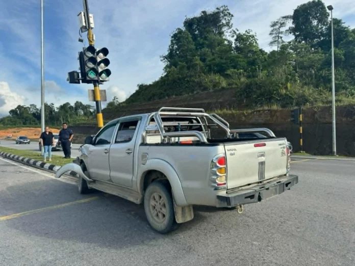 27日下午5时30分,一辆皮卡在乔哈里苏南交通灯路口因刹车不及,先撞上正在等候红绿灯的轿车右侧车身,随后失控冲向路旁交通灯,导致车辆与公共设施受损。