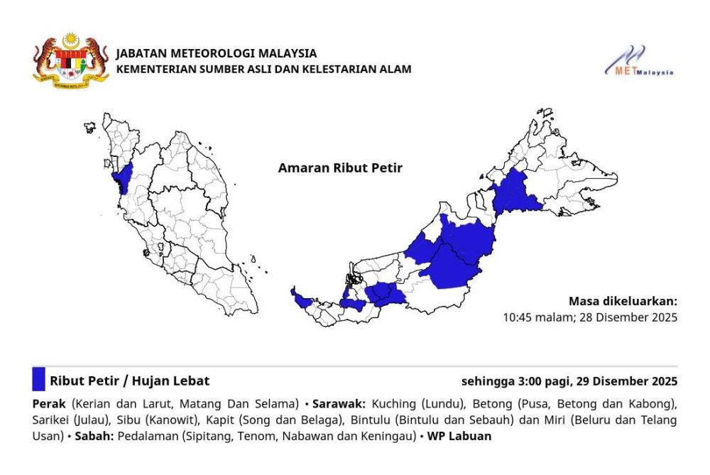 马来西亚气象局发出雷暴警告,预计在2025年12月28日晚上至12月29日凌晨3点期间,多个地区将遭遇强烈的雷暴、暴雨和大风。