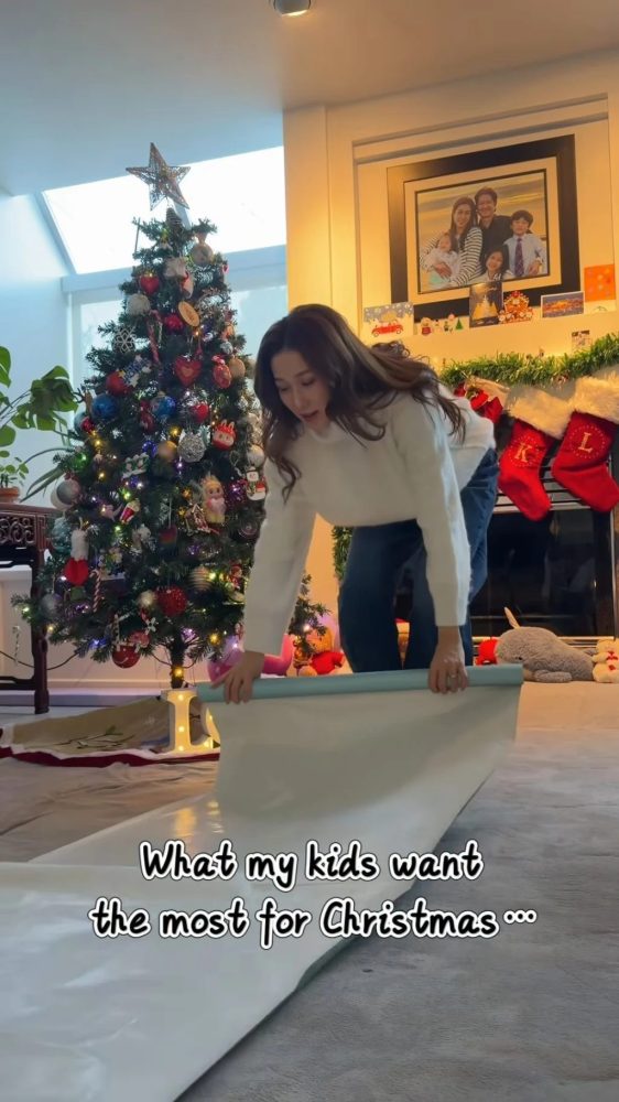 在IG短片中,一家五口围坐圣诞树旁,锺嘉欣用花纸包裹自己,三名子女冲上前拆开花纸,随后四人抱在地上,既搞笑又可爱,显示妈妈是孩子们心中最想要的礼物。