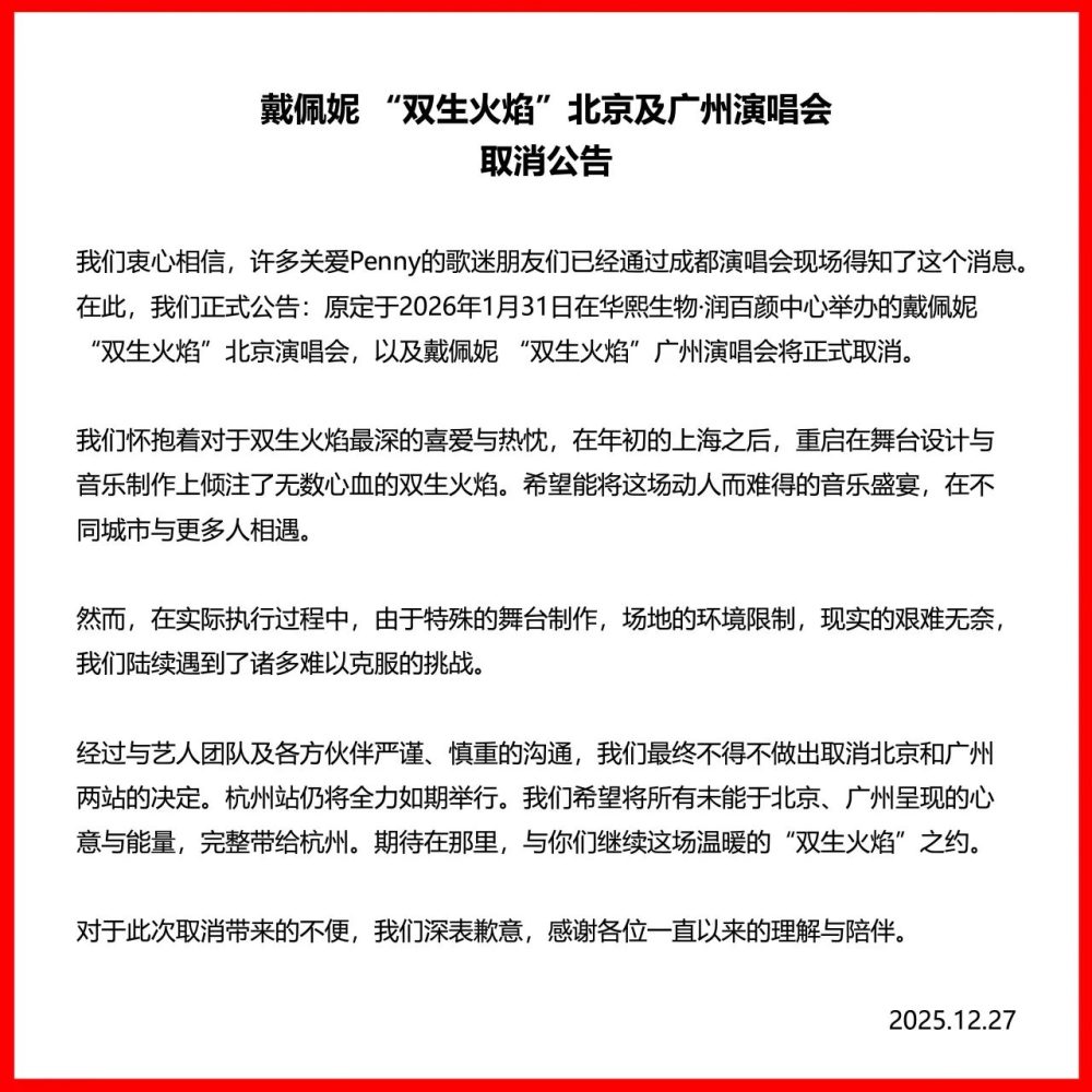 随后,Live Nation发布公告称,因舞台制作特殊、场地环境限制以及现实挑战,经过与艺人团队及各方伙伴沟通,最终取消北京和广州两站演出。