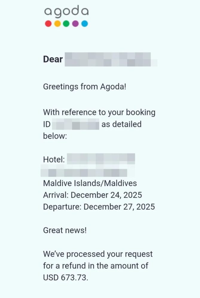 一名男子与家人满怀期待地前往马尔代夫度假,却在通过数码旅游平台Agoda预订酒店时,遇到了一场“幽灵酒店”的闹剧,险些让这次旅程泡汤。