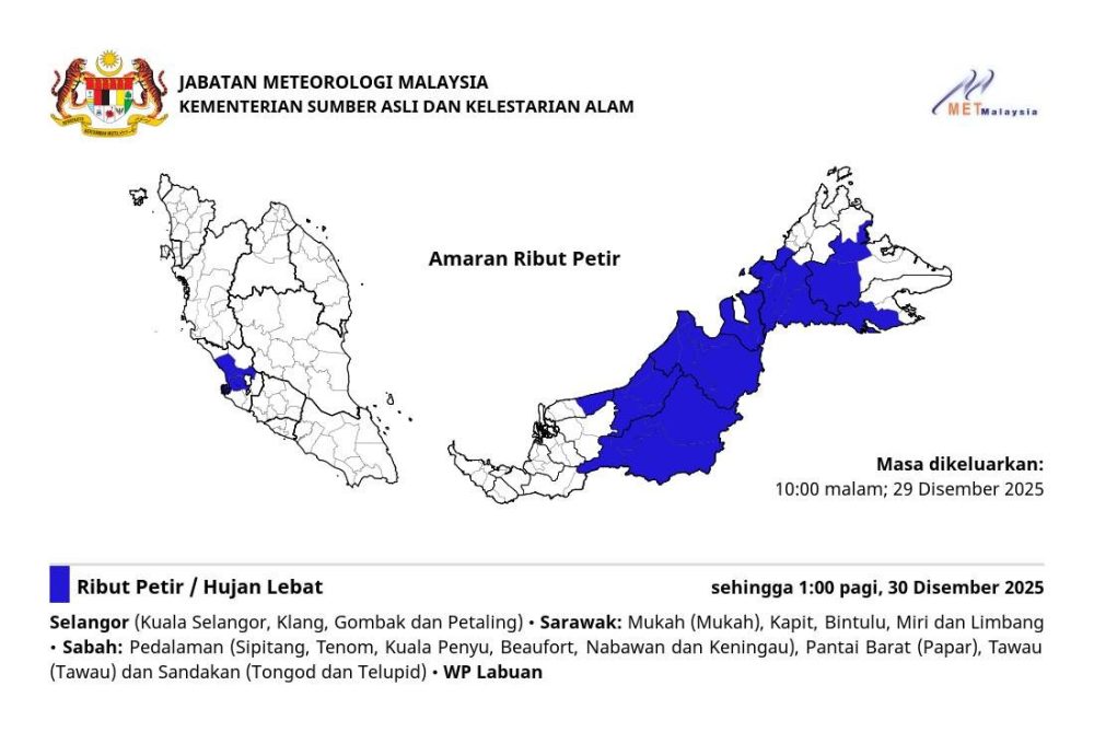 根据气象局的最新预警,预计明天(2025年12月30日星期二)凌晨1:00前,多个地区将遭遇雷暴、暴雨和强风。以下是受到影响的具体区域: