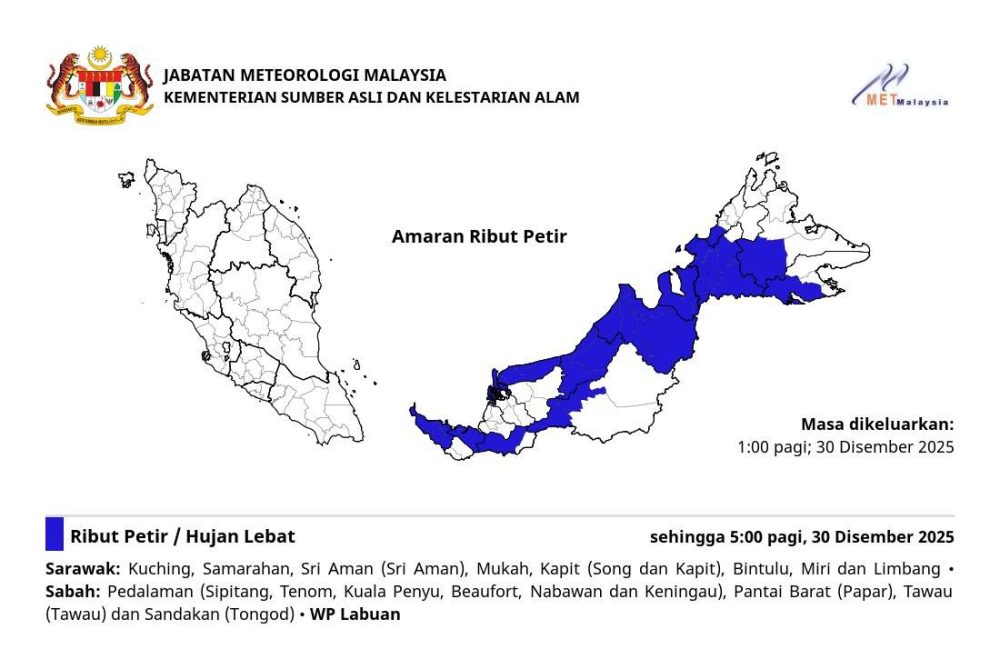 深夜雨不停,东马居民请警惕!大马气象局于2025年12月30日凌晨发布最新一波“雷暴预警”(AMARAN RIBUT PETIR)。预警显示,砂拉越、沙巴多个省份以及纳闽正遭受强雷暴、豪雨及大风袭击,警报将持续生效至今早5时正。