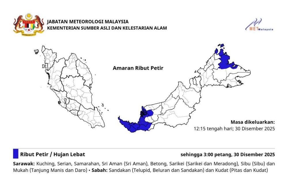 预计上述地区将出现雷暴、大雨及强风天气,警报有效至 2025年12月30日星期二下午3:00。