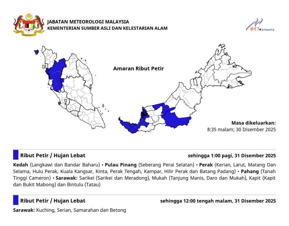 预计 吉打州(兰卡威及巴哈鲁市)、槟城(西北部)、霹雳州(吉打、拉鲁、马当及塞拉马、乌鲁霹雳、瓜拉江沙、金打、霹雳中部、甘榜及下霹雳、巴塘巴当)、彭亨州(金马仑高原)、砂拉越州(沙里基、穆卡、卡皮特及民都鲁)将出现 雷暴、强降雨及大风,警报有效至 2025年12月31日凌晨1点。