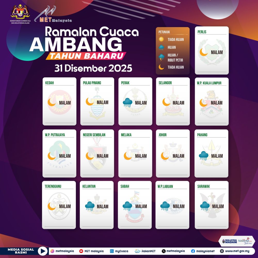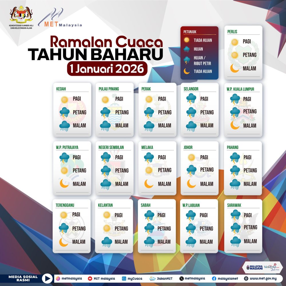 进入2026年元旦当天,雨水将更为广泛。雪兰莪、森美兰、彭亨、砂拉越和沙巴预计全天都会有降雨,提醒居民安排户外活动时提前做好防雨准备。吉隆坡方面,早上和下午有雨,但晚上天气转为良好;槟城则在早晨天气良好,其余时段将迎来降雨,出行需留意道路湿滑状况。