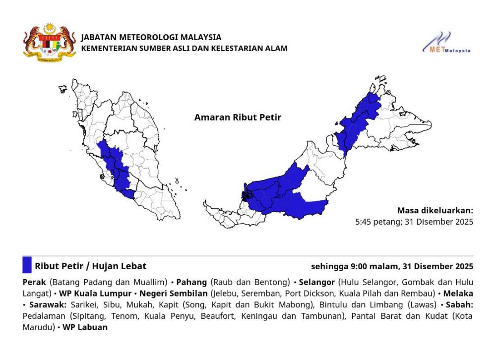 根据气象局于今日傍晚5时45分发布的通告,受影响的西马地区包括霹雳州的峇东巴登与慕阿林、彭亨州的劳勿与文冬、雪兰莪州的乌鲁雪兰莪、鹅唛及乌鲁冷岳、吉隆坡直辖区,以及森美兰州的日叻务、芙蓉、波德申、瓜拉庇劳与林茂,马六甲州也在警报范围内。