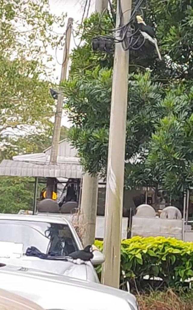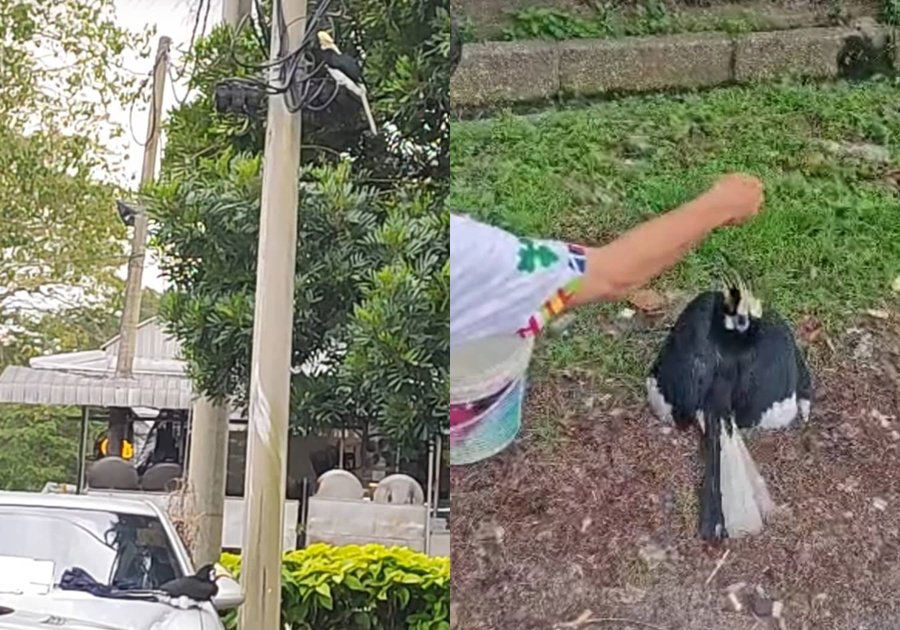 这起事件相信近日发生在霹雳安顺。社交媒体流传的多段视频显示,一只被指是母鸟的冠斑犀鸟疑被车辆撞伤,停留在一辆轿车前方无法起飞;公鸟则停在车顶上方的电缆守护,不时观察母鸟的状况,随后飞落到更靠近的位置陪伴。
