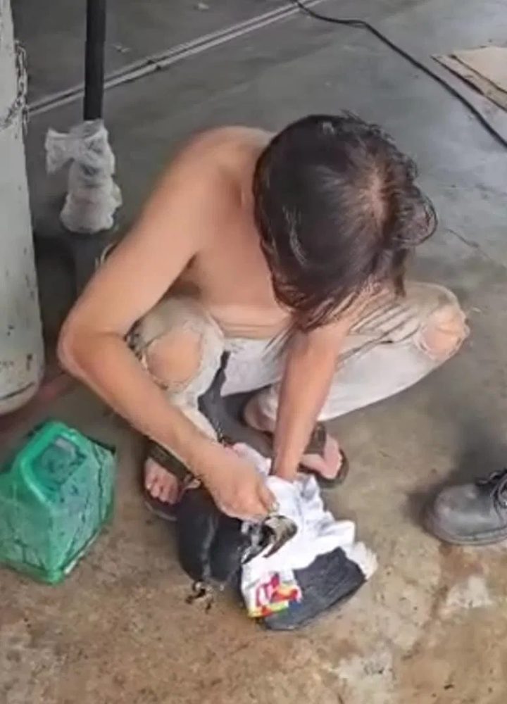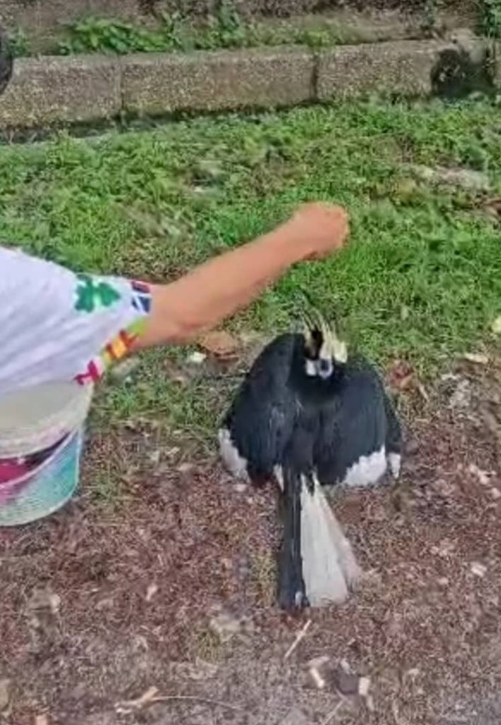 起初,男子表示不敢贸然靠近协助,担心惊吓到受伤的母鸟。不过,后续视频可见另一名男子用手掌盛水,让母犀鸟饮水解渴。母鸟在喝水并稍作休息后,逐渐恢复体力,期间一度展翅尝试飞行。