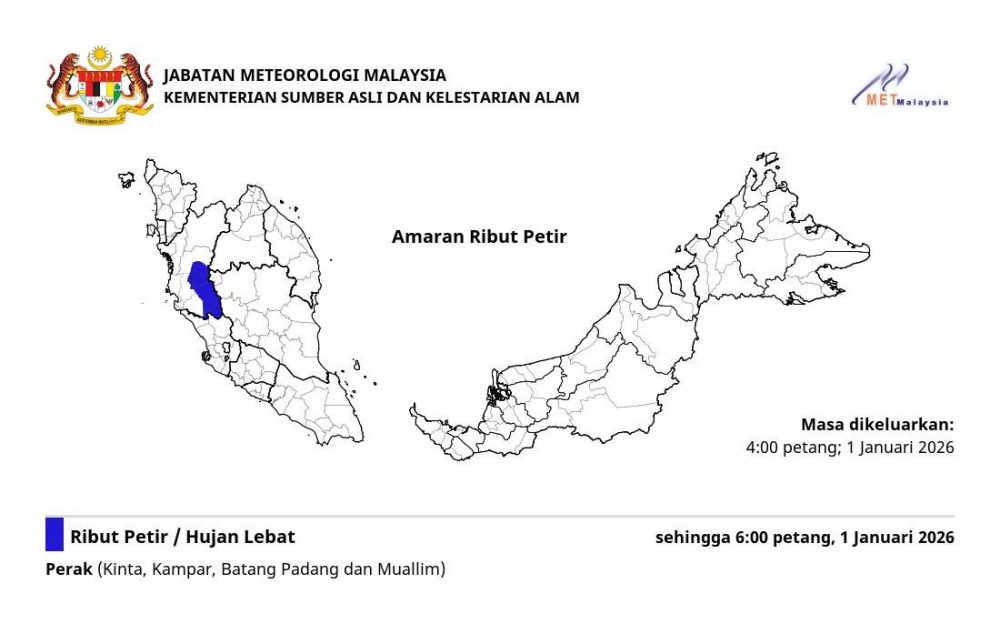 霹雳州(包括金宝、甘马挽、巴塘巴当及穆阿林)预计将出现雷暴、暴雨及强风,警告有效至2026年1月1日星期四下午6时。
