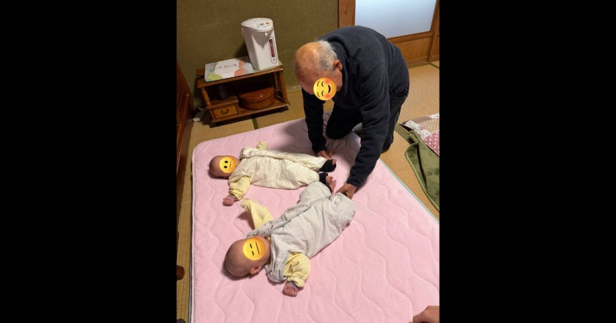该名女子在社交平台 X(前 Twitter)以账号“Cat@2y+双子5m”分享经历,表示跨年期间携家人回婆家探亲,看到丈夫的祖父正温柔地逗弄两名去年7月出生的双胞胎宝宝,忍不住按下快门记录这一刻。