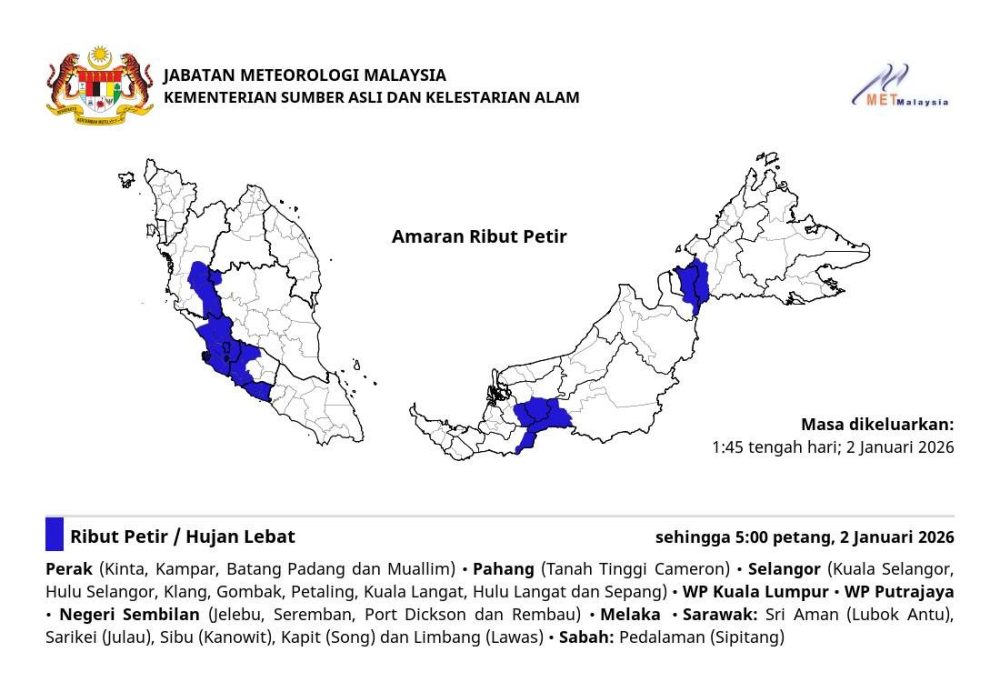 气象局发布天气警报,预计霹雳州(近打、金宝、峇登巴东、慕阿林)、彭亨州(金马仑高原)、雪兰莪州(瓜拉雪兰莪、乌鲁雪兰莪、巴生、鹅唛、八打灵、瓜拉冷岳、乌鲁冷岳及雪邦)、吉隆坡联邦直辖区布城联邦直辖区森美兰州(日叻务、芙蓉、波德申、林茂)、马六甲,以及砂拉越的诗巫安(鲁博安都)、泗里街(如楼)、诗巫(加拿逸)、加帛(宋)和林梦(老越),还有沙巴内陆地区(实必丹),将出现雷暴、强降雨及强风天气。