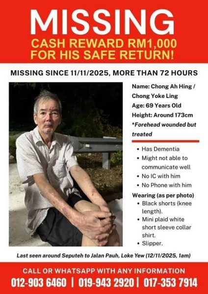 根据《中国报》报道,张亚兴于去年11月11日离开位于吉隆坡蕉赖美华岭(Taman Sri Bahtera)的住家后失去音讯。由于患有失智症,他可能无法清楚沟通,离家时也未携带大马卡及手机。