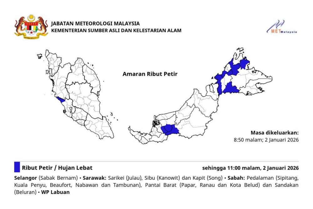 马来西亚气象局(METMalaysia)发布短期雷暴警报,提醒多地将出现雷雨天气,伴随强降雨及强风