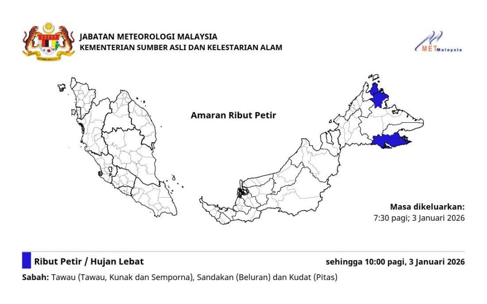 气象单位通报,沙巴州部分地区预计将出现雷暴、强降雨及大风天气,涉及地区包括: