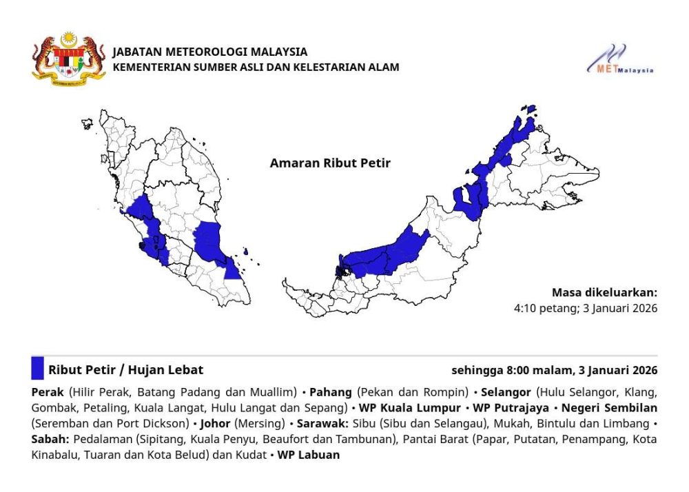 周末傍晚雨神横扫大半个马来西亚!马来西亚气象局于2026年1月3日下午发布最新一波“雷暴预警”(AMARAN RIBUT PETIR)。预警显示,西马多个重点州属(包括雪隆区)以及东马砂拉越、沙巴和纳闽正面临强雷暴、豪雨及大风袭击,警报有效期将持续至今日(1月3日)晚上8时正。