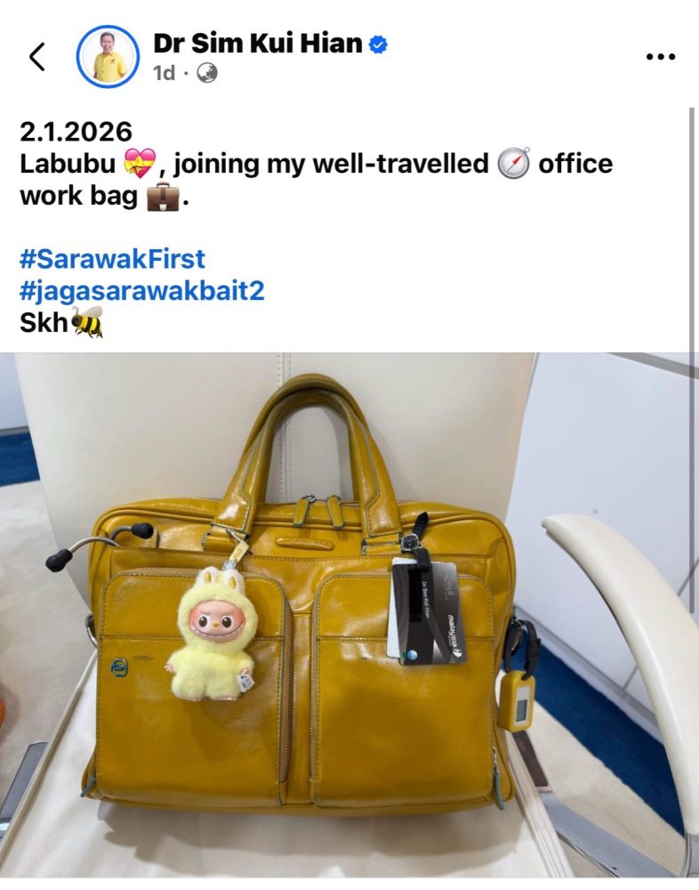 砂拉越副总理兼公共卫生、房屋及地方政府部长沈桂贤早前在社交媒体分享其“走遍各地”的办公公事包,并为公事包挂上可爱玩偶“Labubu”,意外引发网民热议,留言区气氛轻松热闹。