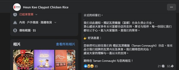 业者同时安抚食客,无需感到惋惜,因为禤记瓦煲鸡饭位于康乐花园的分店将继续营业,招牌瓦煲鸡饭及多款经典料理仍可如常享用,欢迎食客前往支持。