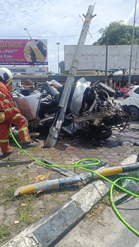 今日下午约2时,武吉格芝靠近登州陆路交通局的十字路口发生一起严重车祸。一辆轿车闯红灯与另一辆行驶中的轿车发生碰撞,导致对方车辆的女司机被困车内,因伤势过重当场死亡。