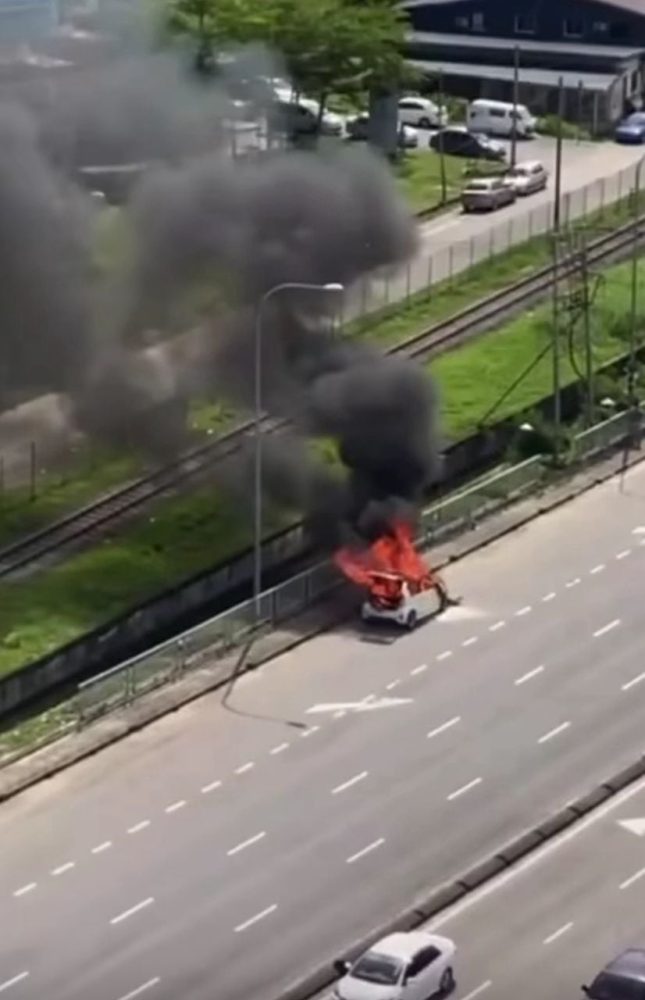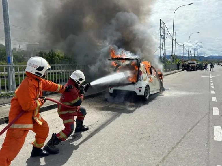 今天早上,在沙巴必打丹前往哥迪咬路,靠近必打丹泛婆罗洲酒店的路段发生一起轿车自燃事件。火势猛烈,浓烟直冲天际,所幸未造成人员伤亡。