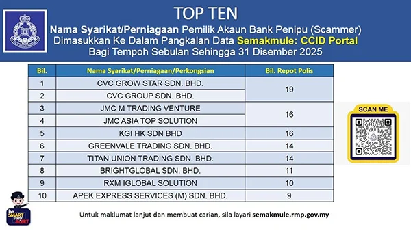 因此,他呼吁民众在转账或进行任何商业往来前,务必先将公司名称或银行户头号码输入“SemakMule”系统进行查证;一旦系统发出警示,就应立即停止交易,以免成为下一名受害者。