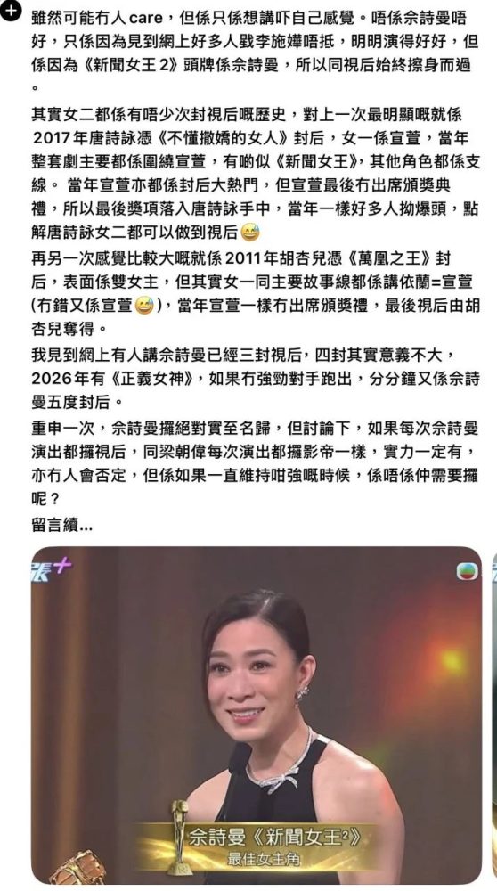该网友进一步指出,佘诗曼过去已3度封后,如今第4次夺奖,象征意义似乎已不再那么重大,并大胆预测,若2026年《正义女神》播出后缺乏强劲对手,佘诗曼极有可能再度登顶,成为五届视后。网友更引用金马奖、金像奖评审曾提出的观点:“不会因为梁朝伟很厉害,就每一部戏都颁影帝给他,评审更希望看到突破。”因此质疑,若佘诗曼每次演出都顺利封后,是否仍符合奖项鼓励多元与突破的初衷。