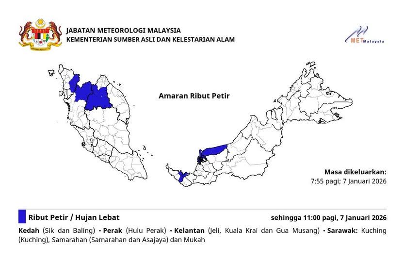 气象部门预测,雷暴、强降雨及强风将影响以下地区,直至2026年1月7日(星期三)上午11时: