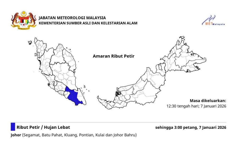 柔佛州(涉地区:昔加末、峇株巴辖、居銮、丰盛港、关口及新山)预计将出现雷暴、暴雨及强风,警报有效至2026年1月7日星期三下午3时。