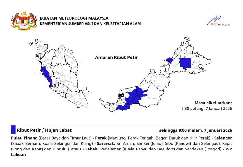 气象部门于2026年1月7日下午6时30分发布雷暴警告,预计今夜至晚间,北马多地及东马部分地区将出现雷暴、强降雨及大风天气。
