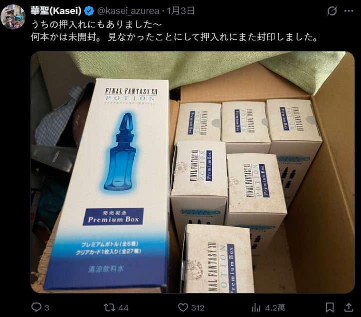 据悉,这瓶饮料源自2006年日本知名游戏Final Fantasy XII与三得利的合作企划,外观仿照游戏中的“药水瓶”设计。当年不少玩家购买后并未饮用,而是作为收藏品保存。