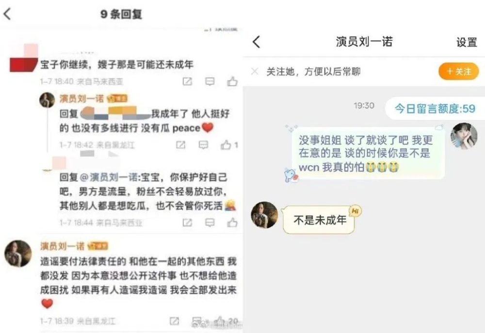 随着恋情浮上台面,双方的“交往时间点”也成为争议焦点。粉丝质疑两人交往时女方是否尚未成年,对此,刘一诺随后出面回应,否认涉及未成年交往。