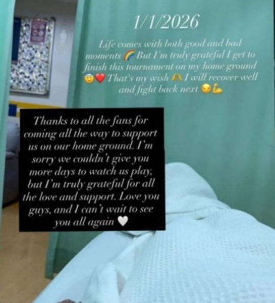 据了解,相关照片搭配的是陈康乐于2026年1月1日发布的贴文。她在文中写道:“人生有好有坏,但我很感恩能在主场完成这项赛事。我会好好康复,然后再战。”文字内容更让不少球迷联想到她带病上阵的可能性。