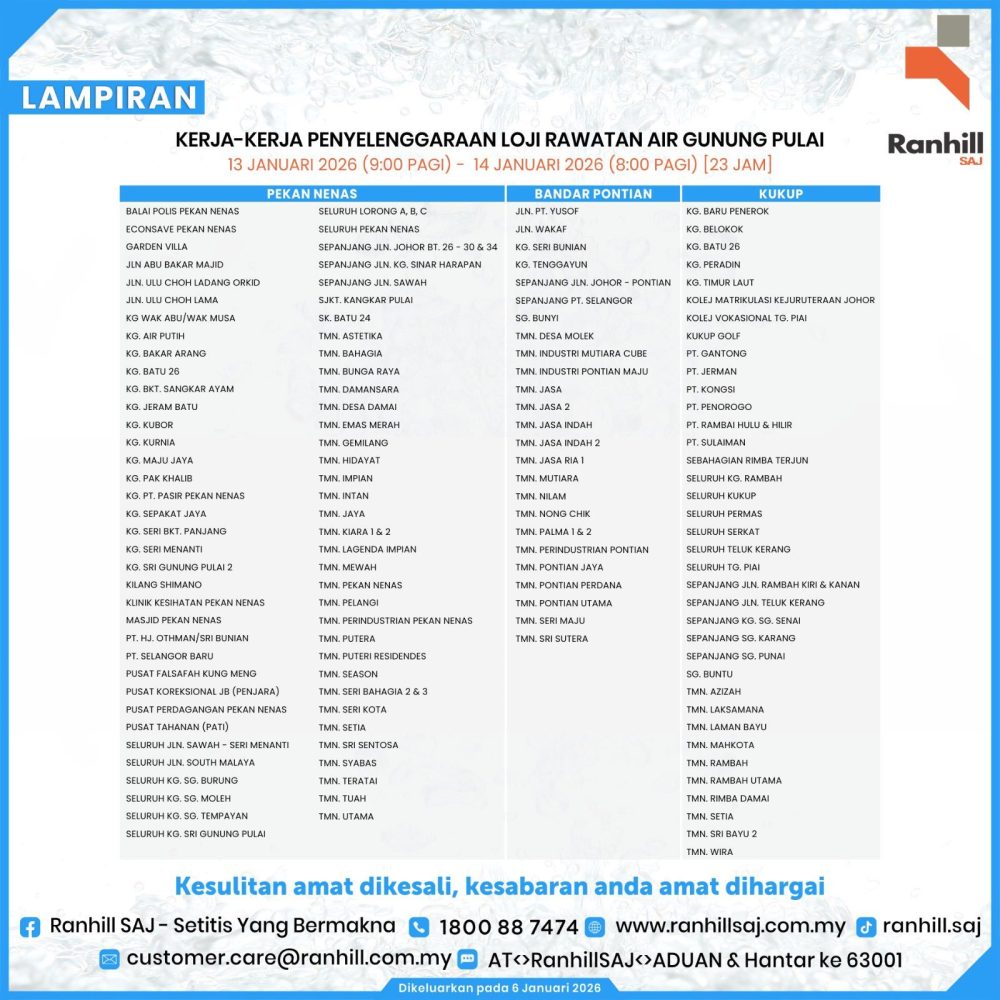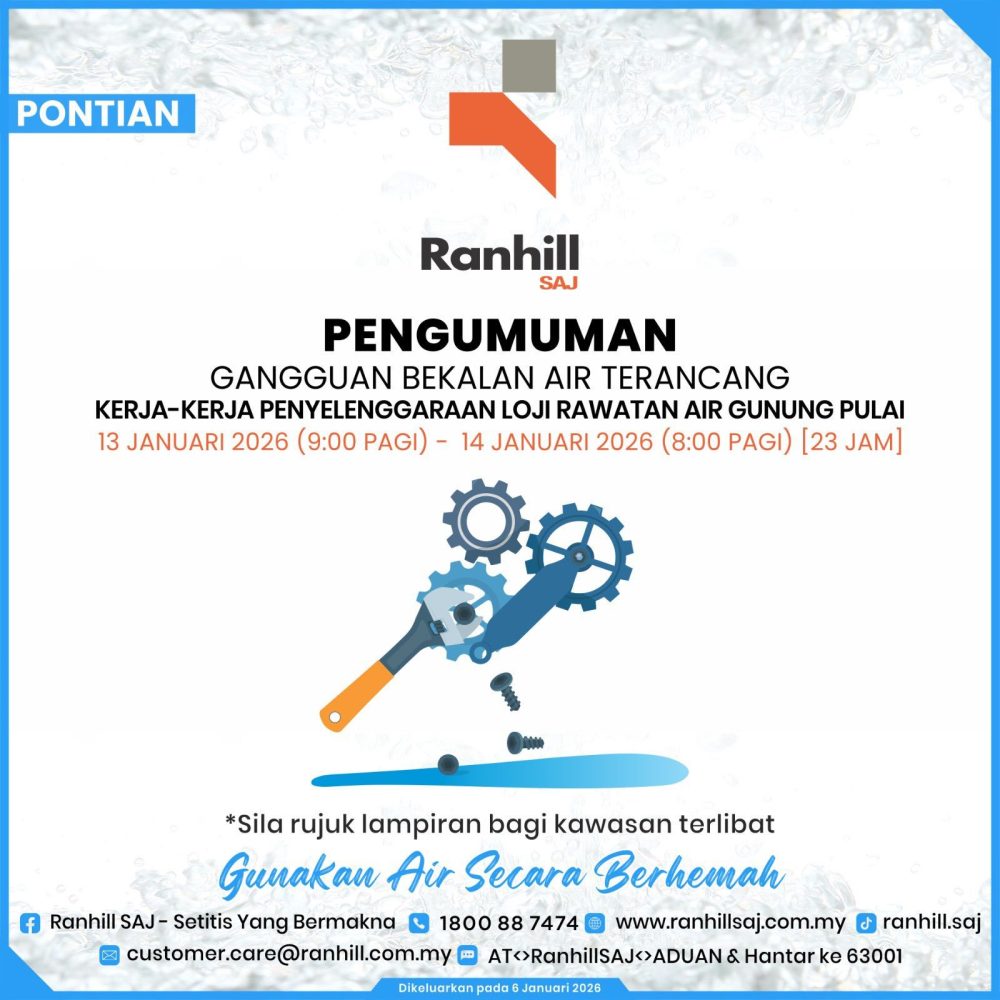 埔莱山滤水站(Loji Rawatan Air Gunung Pulai)将展开例常维修工程,维修期间部分地区的水供或受到影响。柔佛水务联熹私人有限公司(Ranhill SAJ)已发出通告,提醒民众提前做好准备。