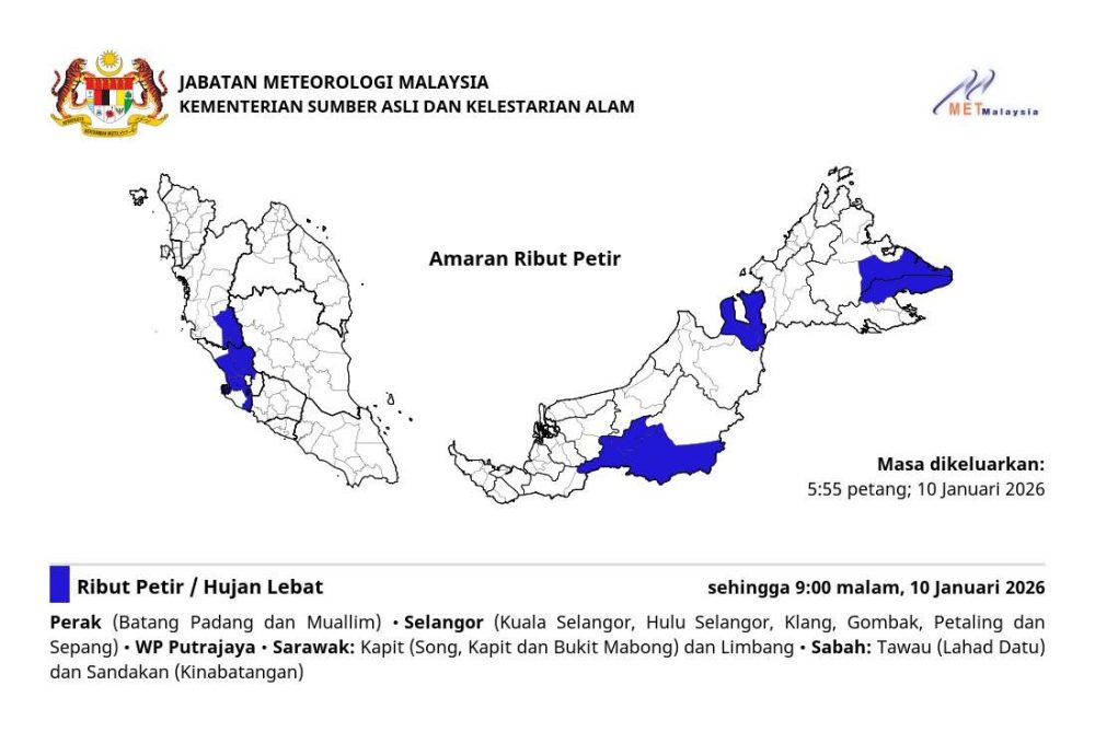 马来西亚气象局今日(1月10日)傍晚发布雷暴警报,预计霹雳、雪兰莪、布城、沙捞越及沙巴部分地区,将出现雷暴、大雨及强风天气,警报有效至今晚9时。