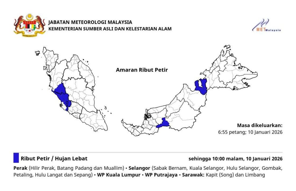 马来西亚气象局今日发布雷暴警报,预计今(10日)下午至晚上多地将出现强雷暴、暴雨及大风。受影响地区包括: