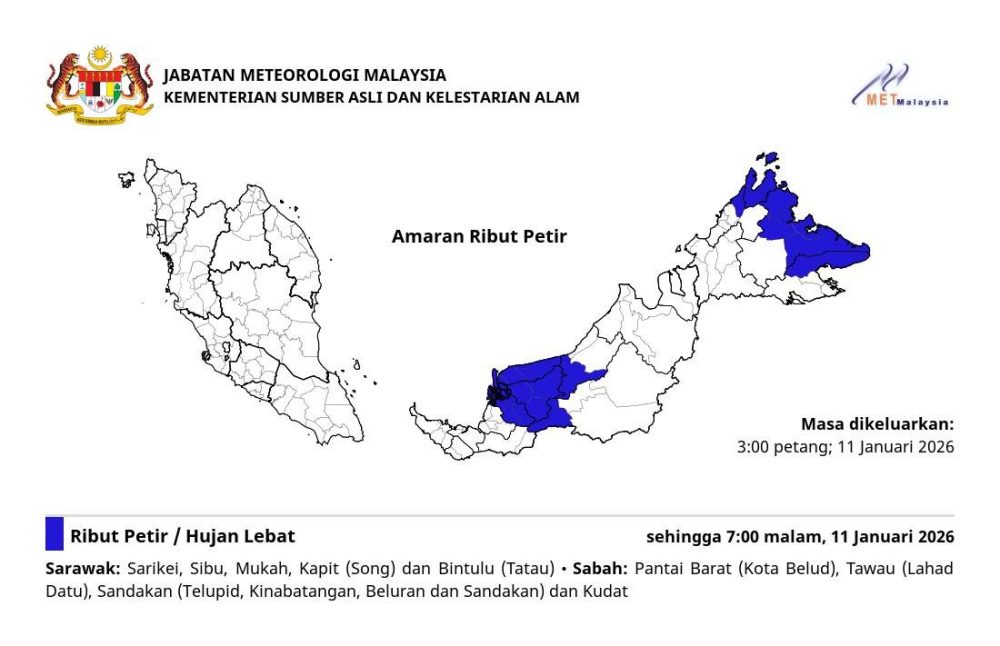 周日傍晚出门请注意,东马雨神再度发威!大马气象局今日下午发布了最新的“雷暴预警”(AMARAN RIBUT PETIR)。预警指出,砂拉越中部及沙巴多个县市正遭受强雷暴、豪雨及大风袭击,警报有效期持续至今日(1月11日)晚上7时正。