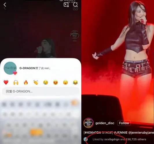 有眼尖网友发现,GD曾短暂按赞Jennie的表演影片,但没多久就收回,引起网友热议,并让两人的过往绯闻再度被翻出。