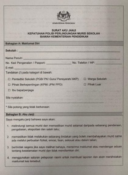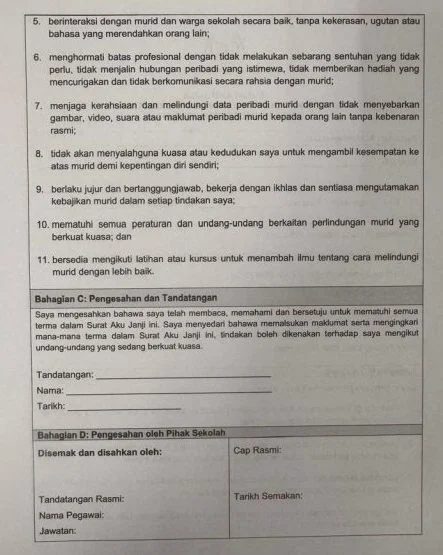 据《星洲日报》向吉隆坡某学校取得的承诺书显示,签署者若提供虚假资料或违反条款,将依法承担责任。