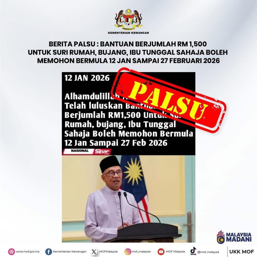 马来西亚财政部在官方脸书专页发文指出,网上所指称的援助计划——包括针对家庭主妇、单身人士或单亲妈妈,并声称可在2026年1月12日至2月27日期间提出申请——并不存在。