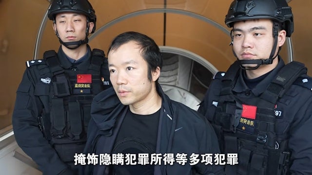 视频显示,陈志身穿蓝色拘押服、双手被铐,在全副武装特警押送下下机,头套被摘下时目光低垂。官方报道称,这是中柬执法合作取得的又一重大成果。