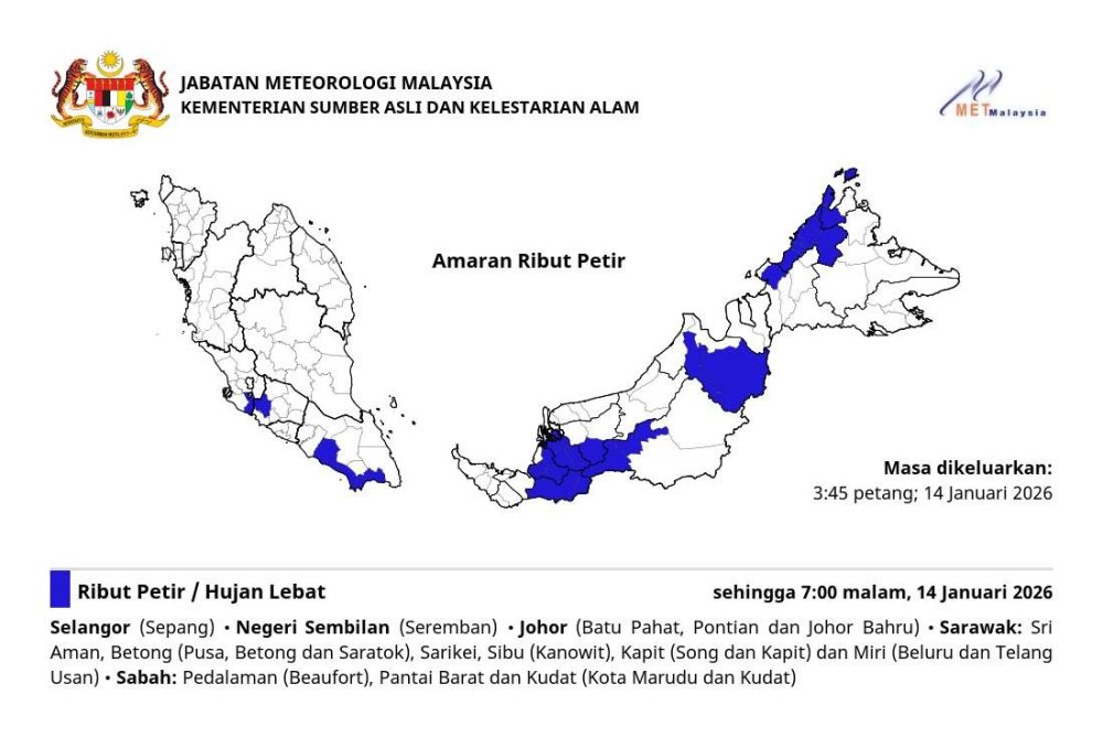 气象部门发布雷暴警告,预计今日(2026年1月14日)至晚上7时,部分地区将出现雷暴、暴雨及强风天气。受影响地区包括: