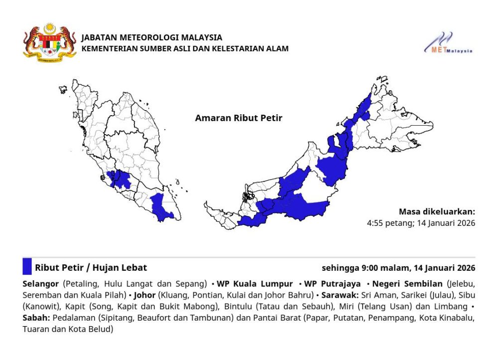 - 东马内陆预警:砂拉越及沙巴内陆地区的居民需提防短时间内强降雨可能导致的河水暴涨。
