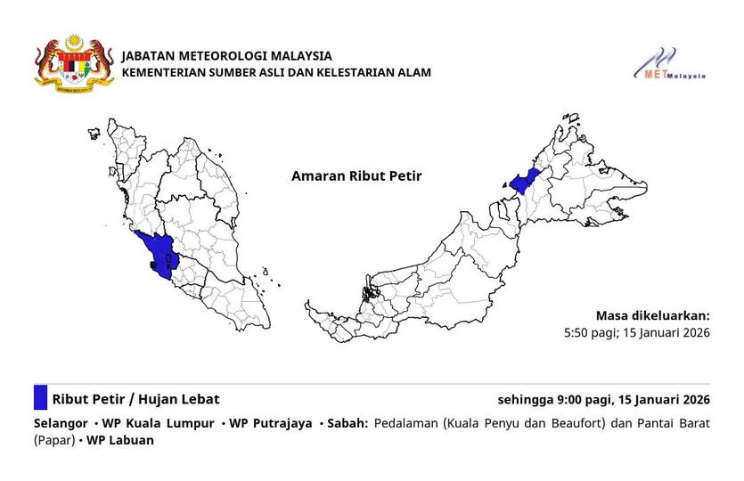 根据马来西亚气象局通报,警报于1月15日清晨5时50分发布,有效至上午9时。受影响地区包括: