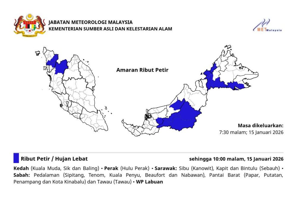 根据当局于今晚7时30分发出的通告,受影响地区涵盖半岛北部及东马多地。半岛方面,包括吉打州的瓜拉姆达、锡及华玲,以及霹雳州上霹雳一带。