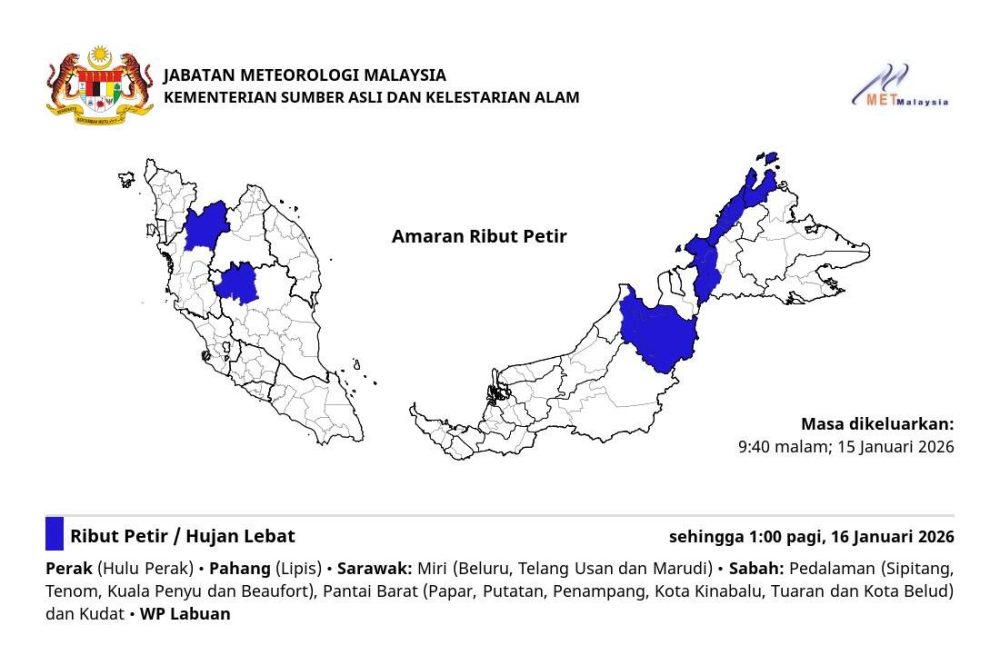 气象部门发布警告,预计至2026年1月16日(星期五)凌晨1时,以下地区将出现雷暴、大雨及强风天气: