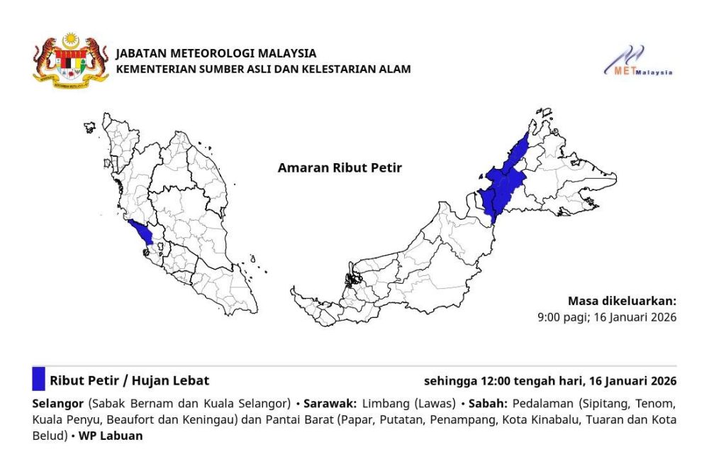 预计将有雷暴、强降雨及强风侵袭以下地区,直至2026年1月16日(星期五)中午12时