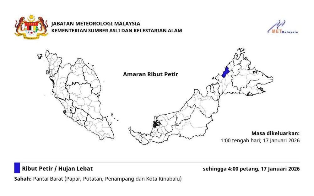 沙巴州气象局预计,17日(星期六)西海岸地区包括Papar、Putatan、Penampang及哥打京那巴鲁,将出现雷暴、暴雨及强风,警报有效至下午4时。