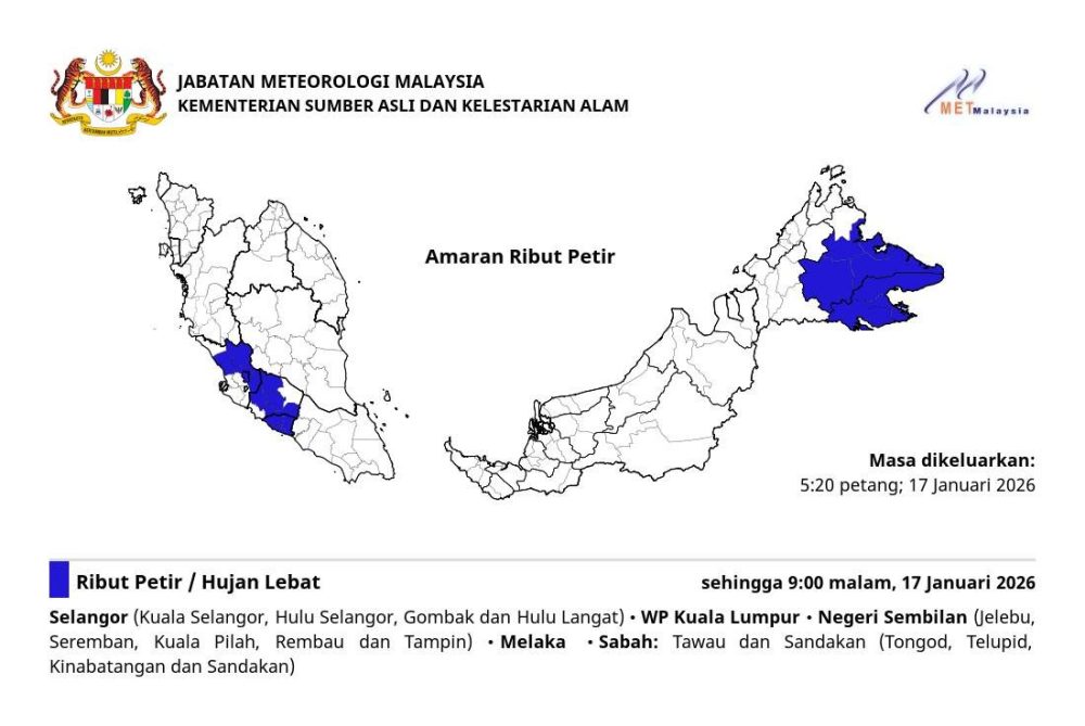 周末晚间打算出门或聚餐的民众请高度警惕!大马气象局今日傍晚发布了最新的“雷暴预警”(AMARAN RIBUT PETIR)。预警显示,巴生谷核心地带、森美兰、马六甲以及沙巴东海岸正遭受强雷暴、豪雨及大风袭击,预计恶劣天气将持续至今日(1月17日)晚上9时正。